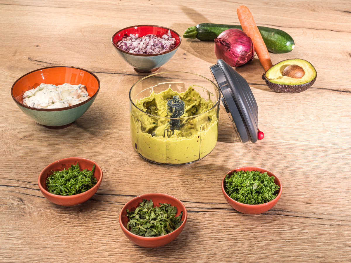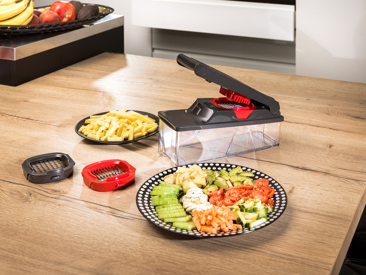VERTICO Vertical vegetable slicer: Tack vare den vertikala positionen och tryckknappen kan du skära dina favoritgrönsaker och frukter helt säkert, utan risk för skador. Kommer med flera olika skäralternativ (enkelt att skjuta reglaget i sidled)