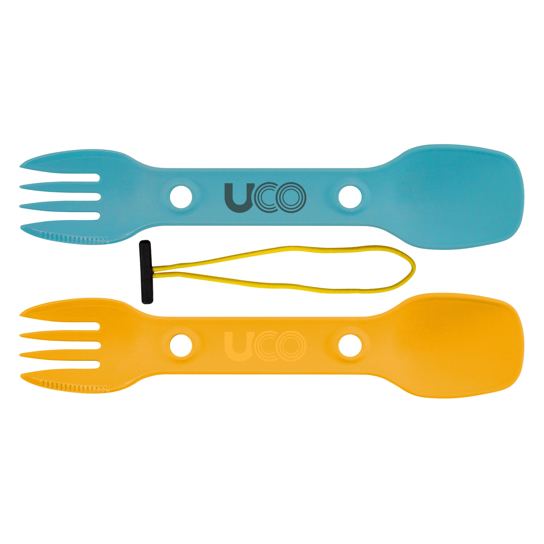 Strategiskt placerade hål (minskar vikt på sporken) används med återanvändbart silikonsnöre för att fästa, packa eller hänga Utility Sporken.