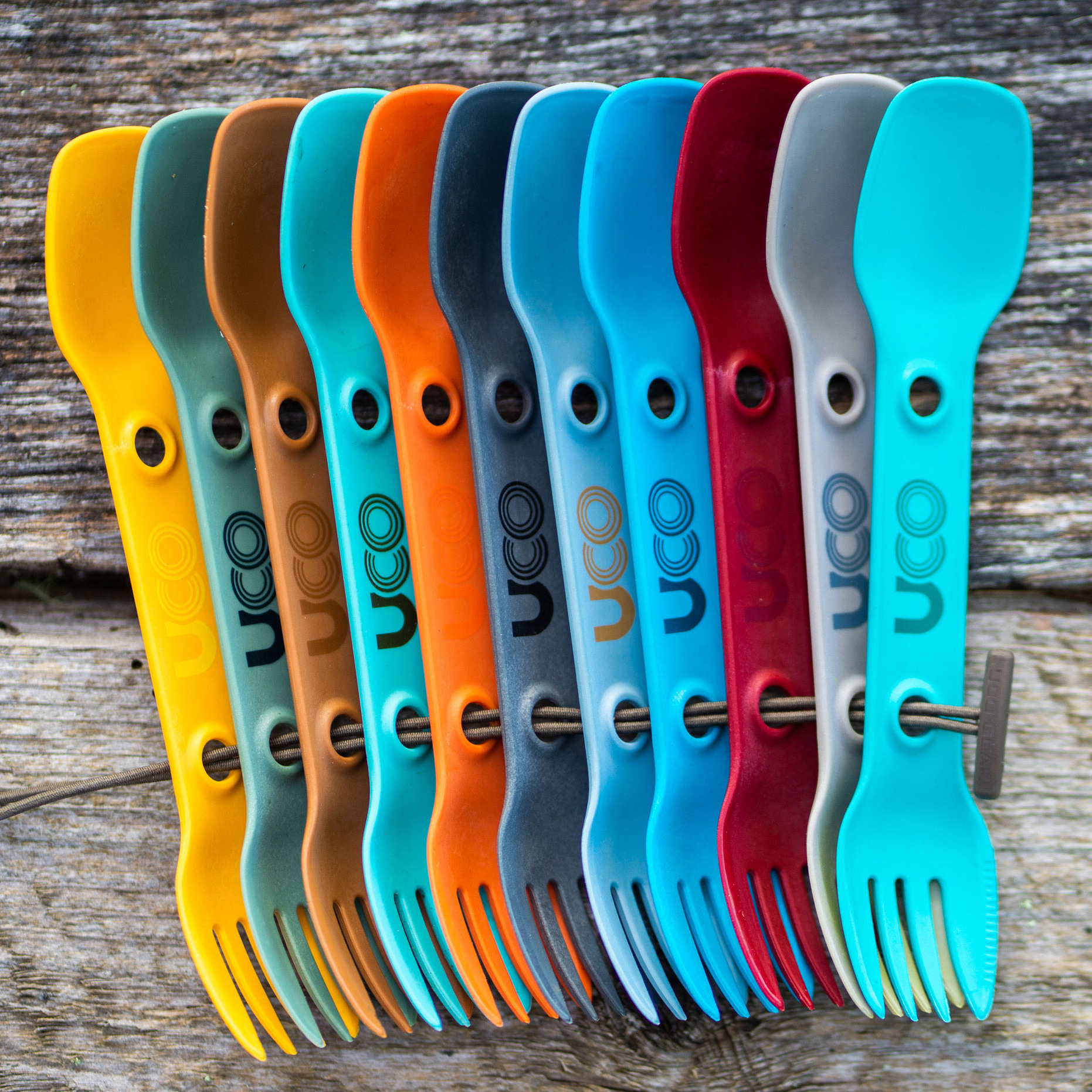 Strategiskt placerade hål (minskar vikt på sporken) används med återanvändbart silikonsnöre för att fästa, packa eller hänga Utility Sporken.