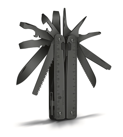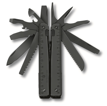 Denna SwissTool har ett s k "liner lock" system som låser alla verktygen i utfällt läge för maximal säkerhet. Den är 115 mm lång och väger 286 gram med sina 28 funktioner.