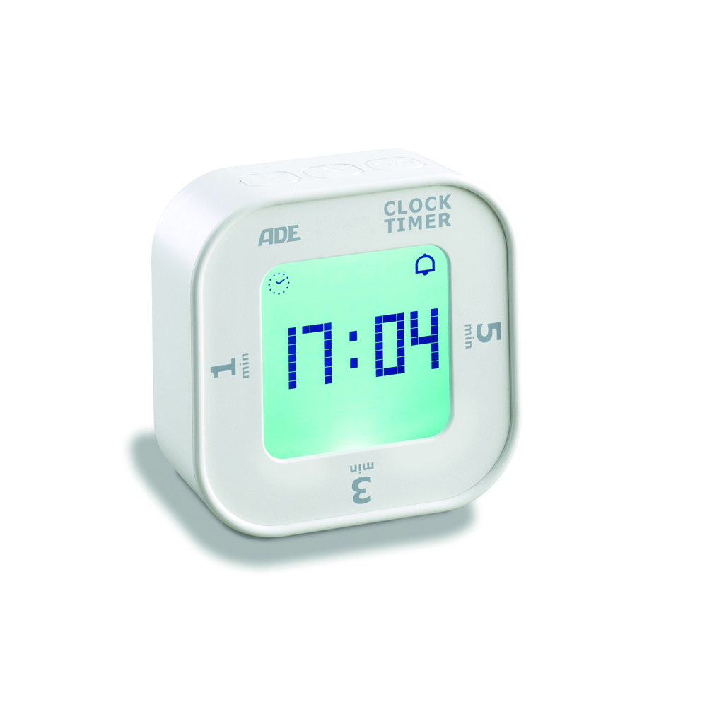 Tilta eller trycka. Det är dags för den digitala kökstimern med tilt-start från ADE, som också visar aktuell tid och fungerar väl utanför köket! Den har tre förinställda nedräkningar: 1, 3 och 5 minuter. De kan aktiveras mycket enkelt genom att luta timern till respektive sida. Även enskilda tider kan ställas in på LCD-skärmen genom att bara trycka på en knapp. När tiden är slut signalerar displayen: Klar! Men ett akustiskt larm kan också ställas in. Bär du din timer med dig? Då är vibrationslarmet meningsfullt, vilket också är ett tillgängligt val.