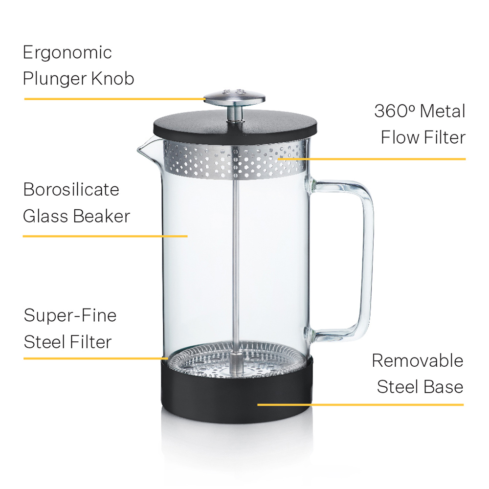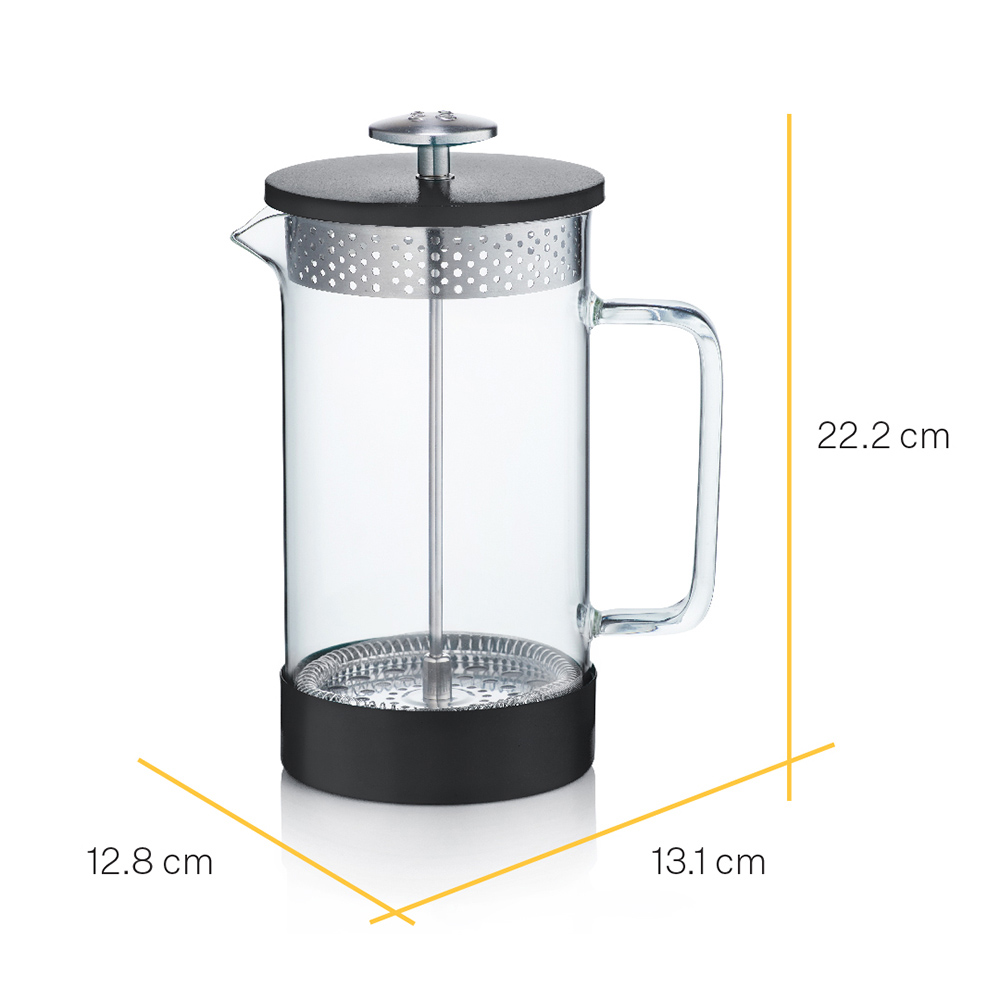 Det stora glashandtaget har utformats för att vara bekvämt att hålla när kannan är fullt och & Co knoppen ger större stabilitet när du pressar och kan enkelt greppas så att det fina rostfria filtret kan tas bort för rengöring.