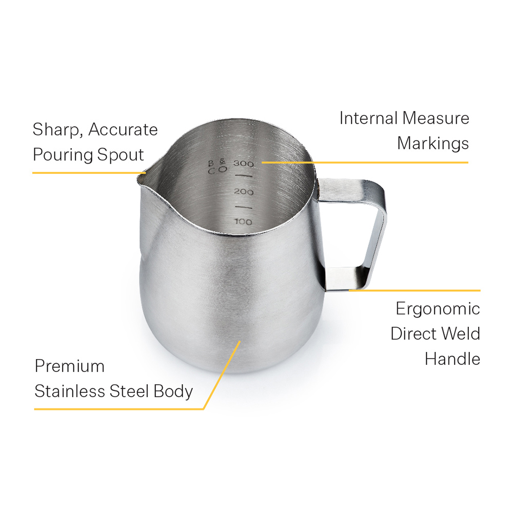 - Noggrann servering - de interna måttmarkeringarna gör att mängden mjölk kan mätas vilket minskar slöseriet och ger en guide till rätt mjölk- och mikroskumvolym för cappuccino, latte, flatwhite eller annat kaffe med mjöl.