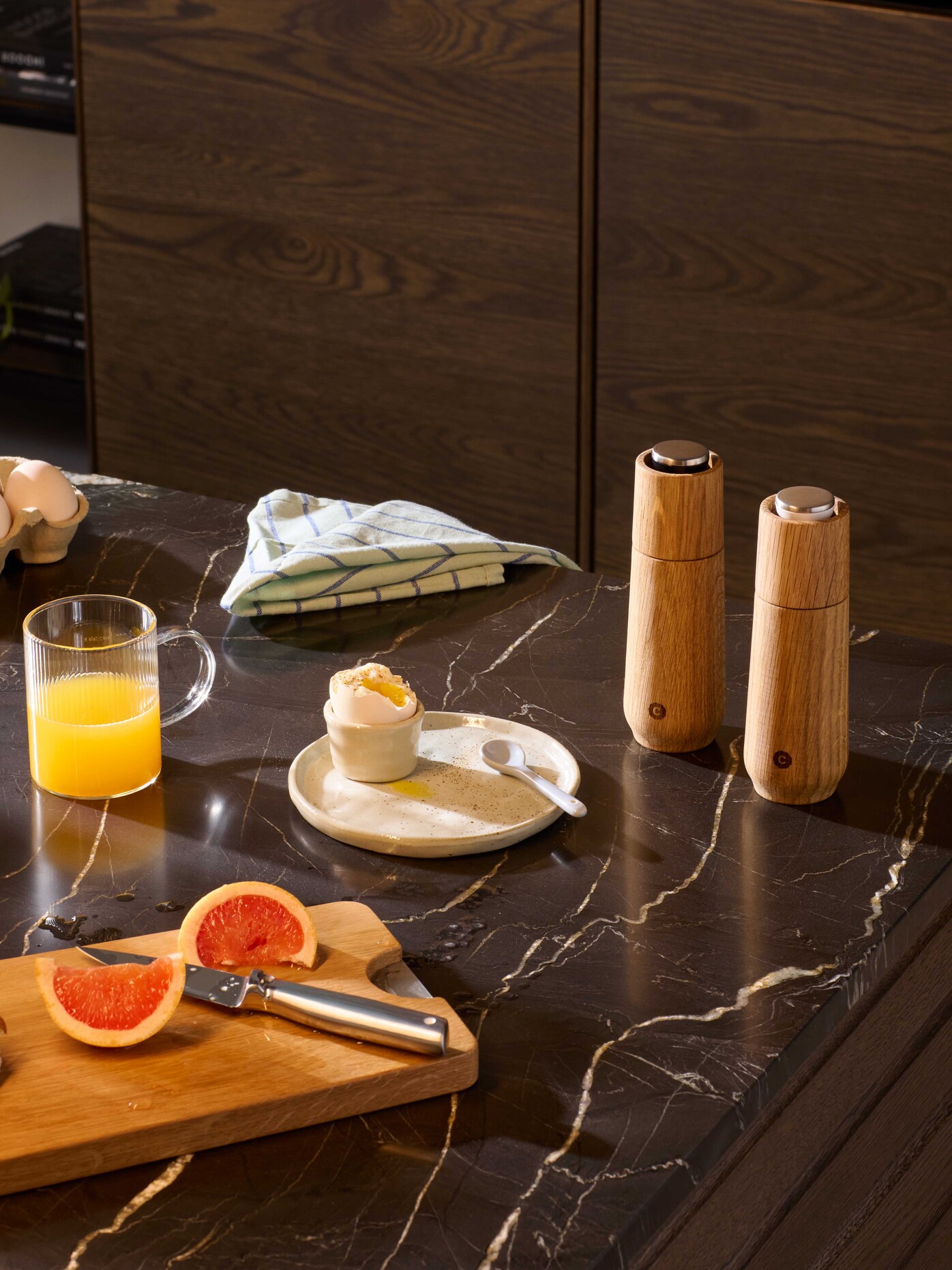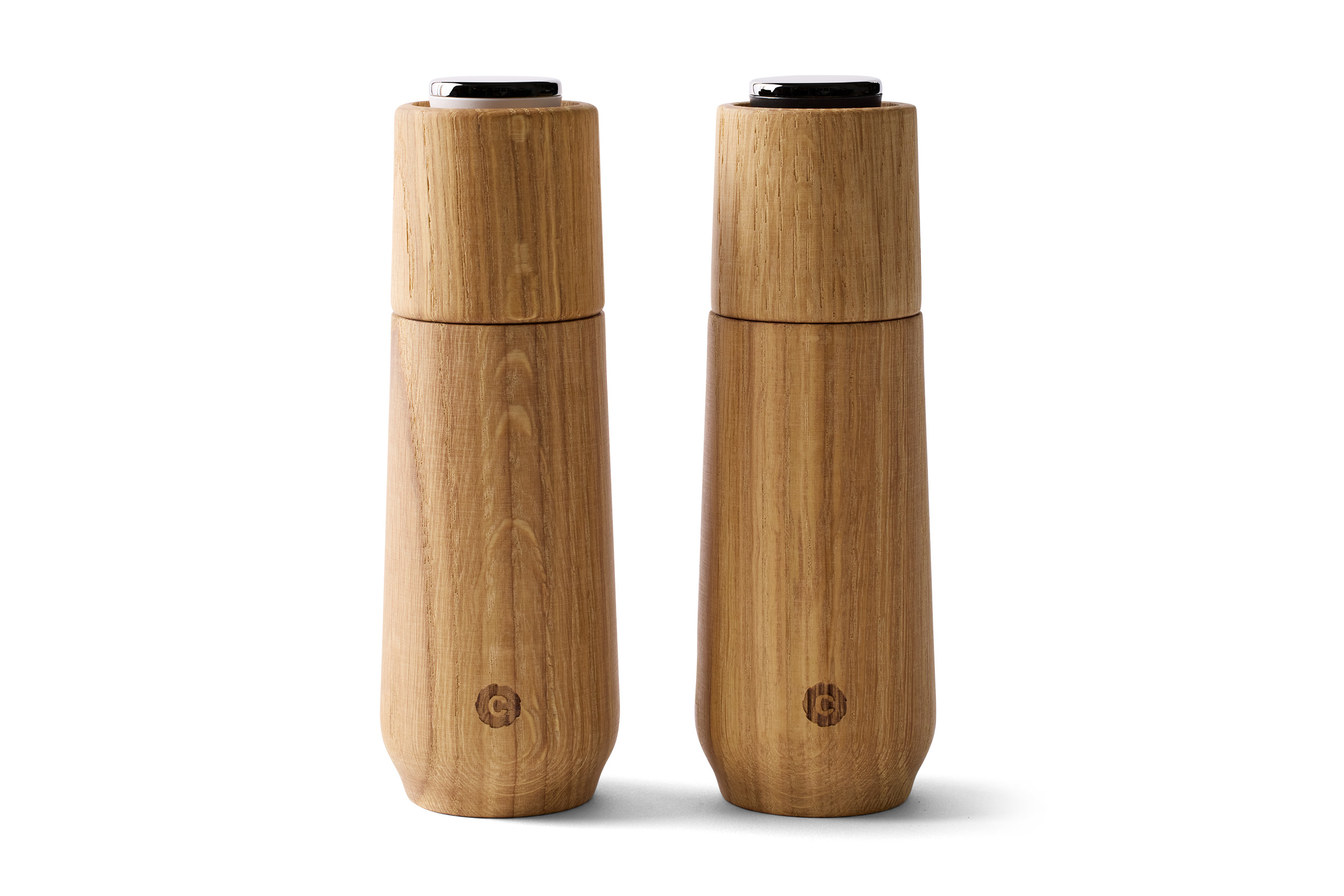 Champagne kombinerar funktion med ett uttryck som tar plats. En liten svart eller vit ring markerar enkelt vilken kvarn som är salt eller peppar. Mekanismen är byggd för att mala hela torkade kryddor och släppa fram aromer och smak med precision. Naturliga variationer i ek kan förekomma.