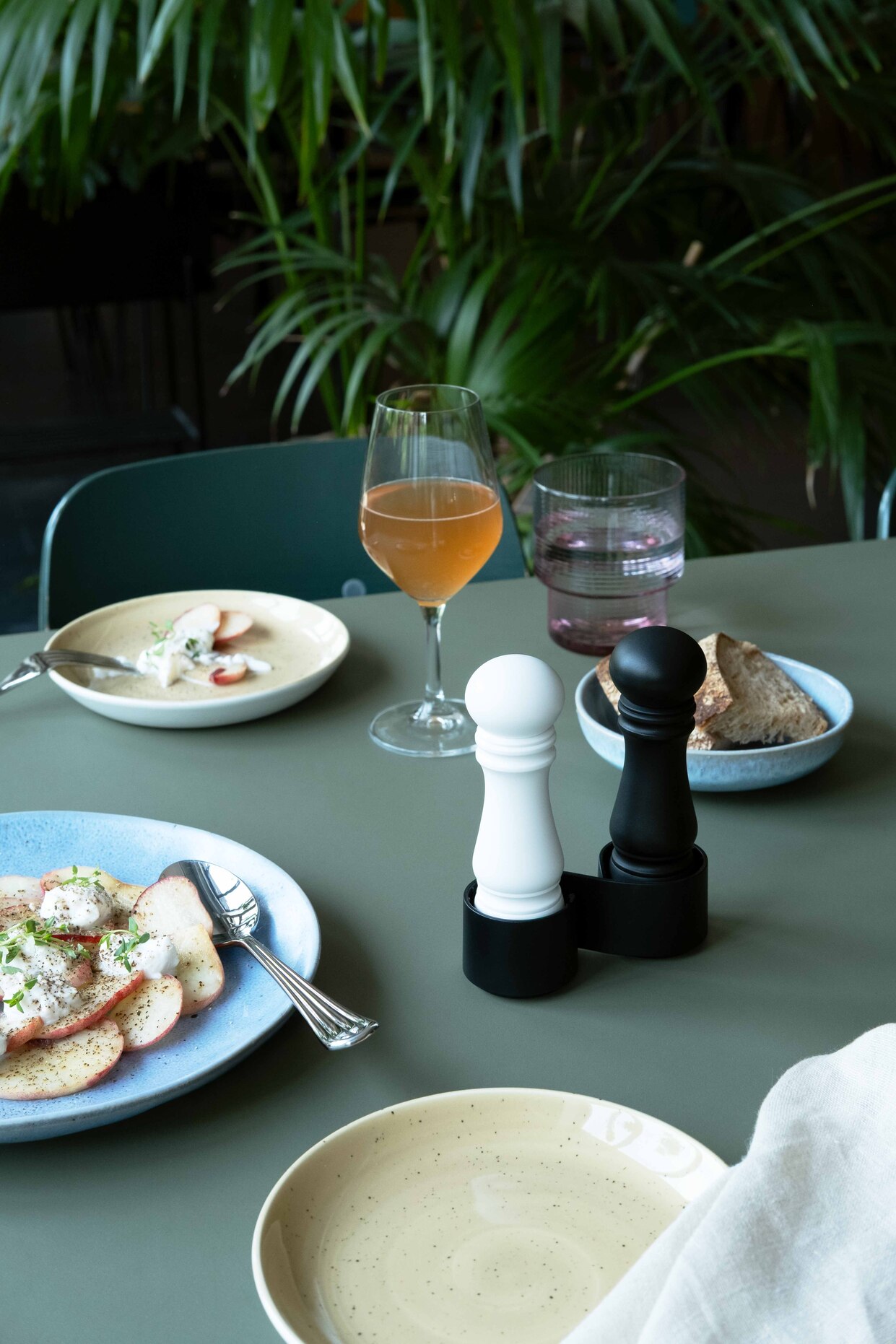 De små men kraftfulla Mini-kvarnarna är byggda för att följa med dig – från picknick i parken till camping i skogen eller som ett stilrent komplement på matbordet. Hållaren håller kvarnarna samlade och fångar upp kryddrester, så du slipper både kladd och spill. När det är dags att flytta setet greppar du bara topparna och lyfter dem tillsammans – snabbt, rent och genomtänkt.