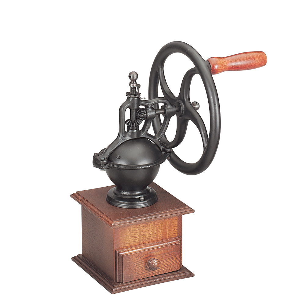 Eppicotispai Traditionell kaffekvarn av gjutjärn och trä. Ställbart verk. Kvarnen har ett koniskt malverk för bästa resultat.