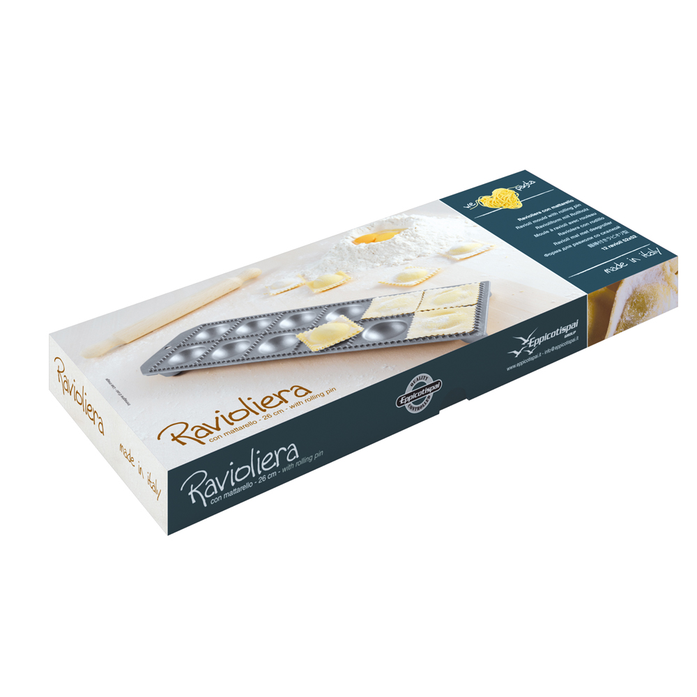 Eppicotispai Ravioliform av aluminium med 12 runda hål samt en kavel av bok. Formen gör raviolis med måtten 52 x 52 mm