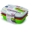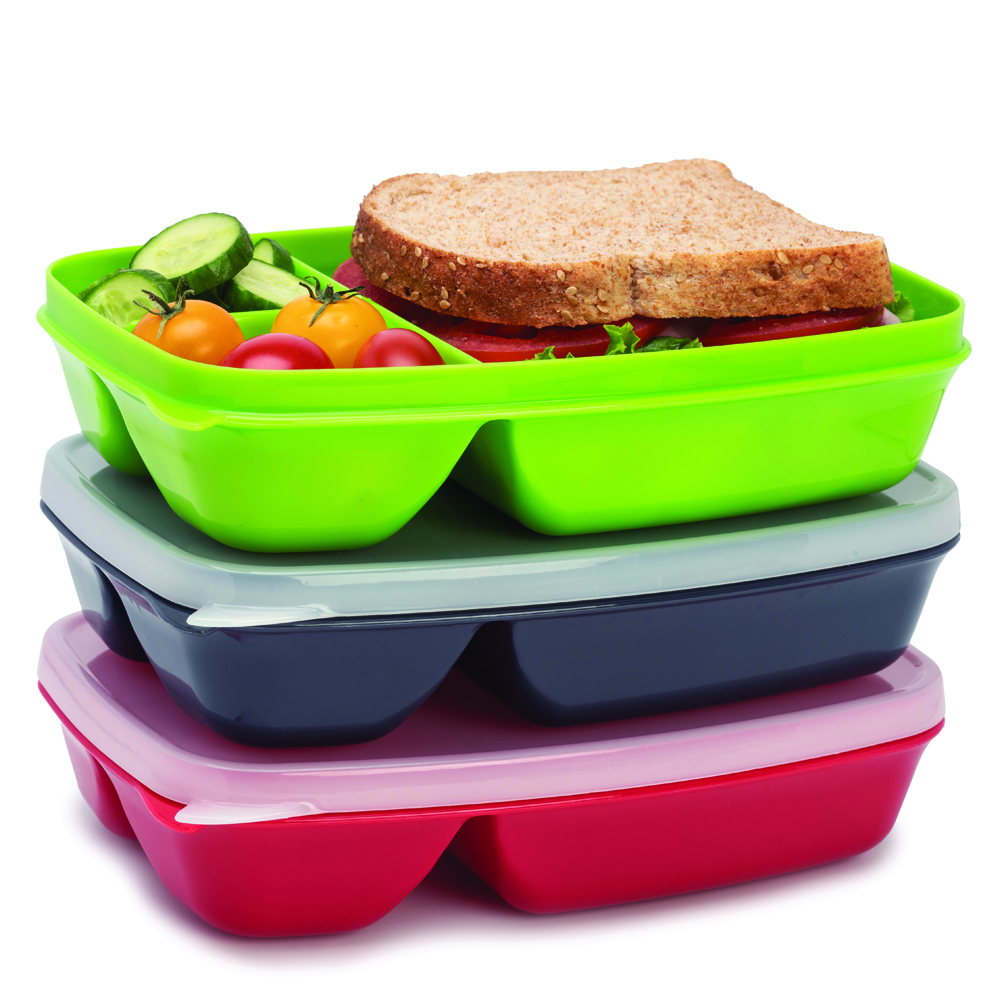 Joie 3-pack Matlådor med 3 fack. Det stora facket för huvudrätten rymmer 550 ml och de två små facken för tillbehören rymmer 100 ml vardera. Kan diskas i diskmaskin på översta hyllan. Kan användas i mikrovågsugnen utan locket. Perfekt lunchlåda!