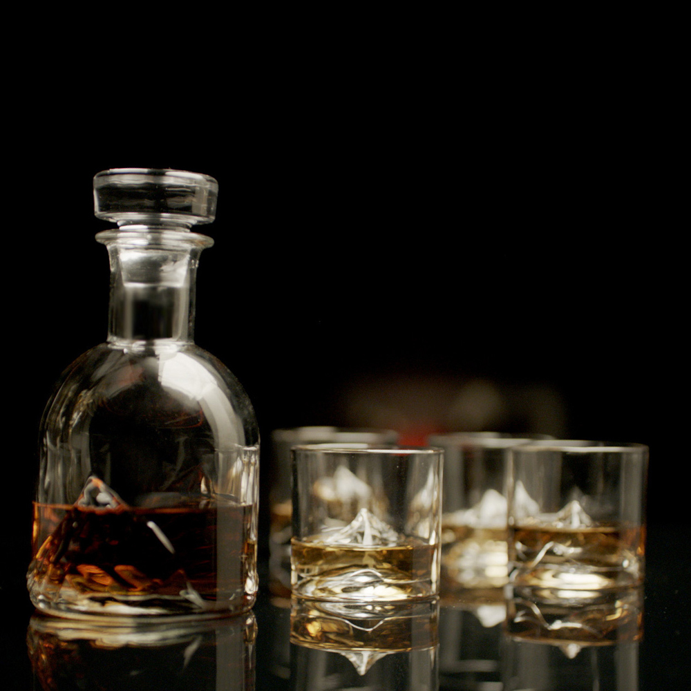 LIITON Whisky Set med 4 glas och karaff av blyfri kristall. Glasen har Chill Charge System som kyler drycken på några sekunder. Glasens botten är utformade som det ikoniska berget Mount Everest. Karaffen matchar glasen.