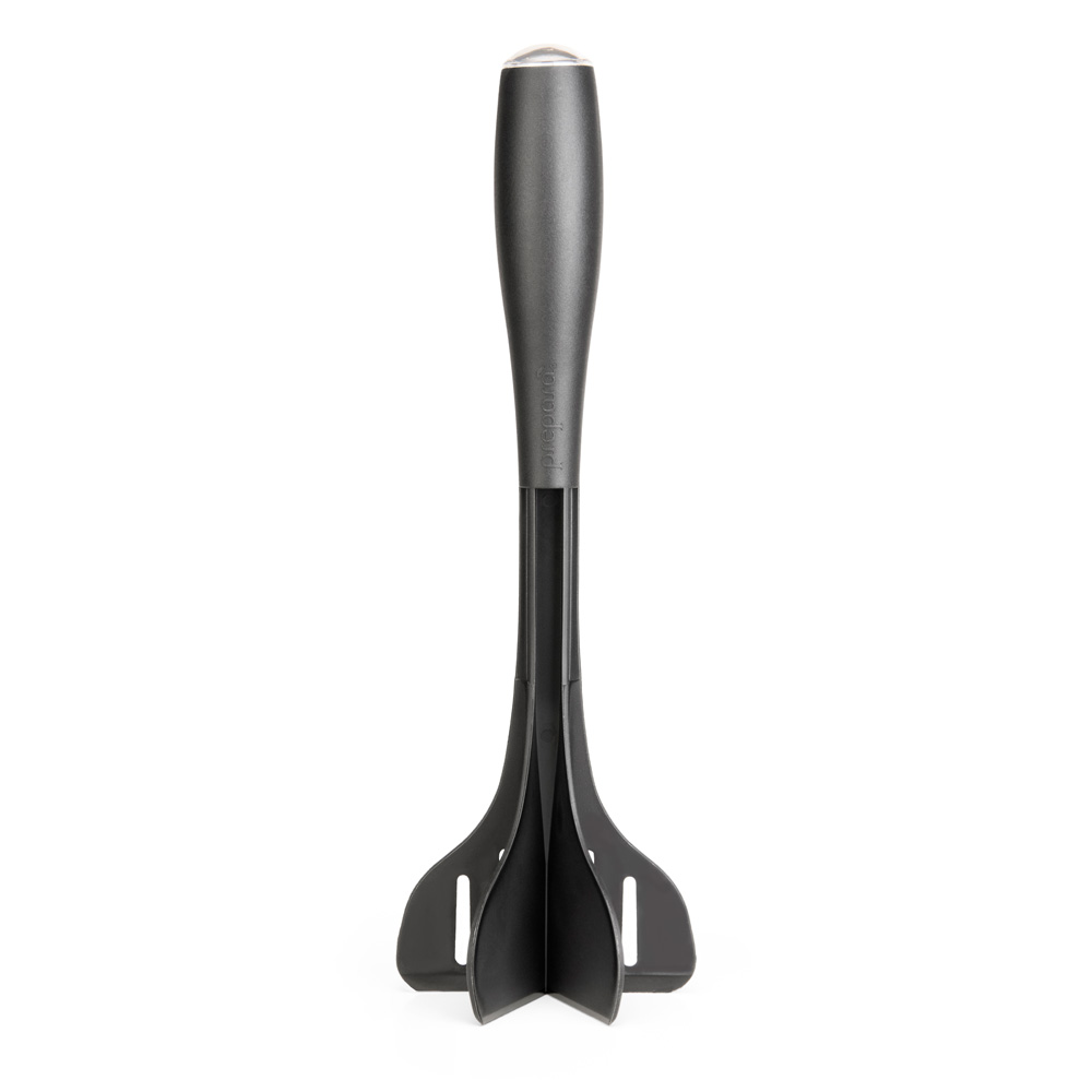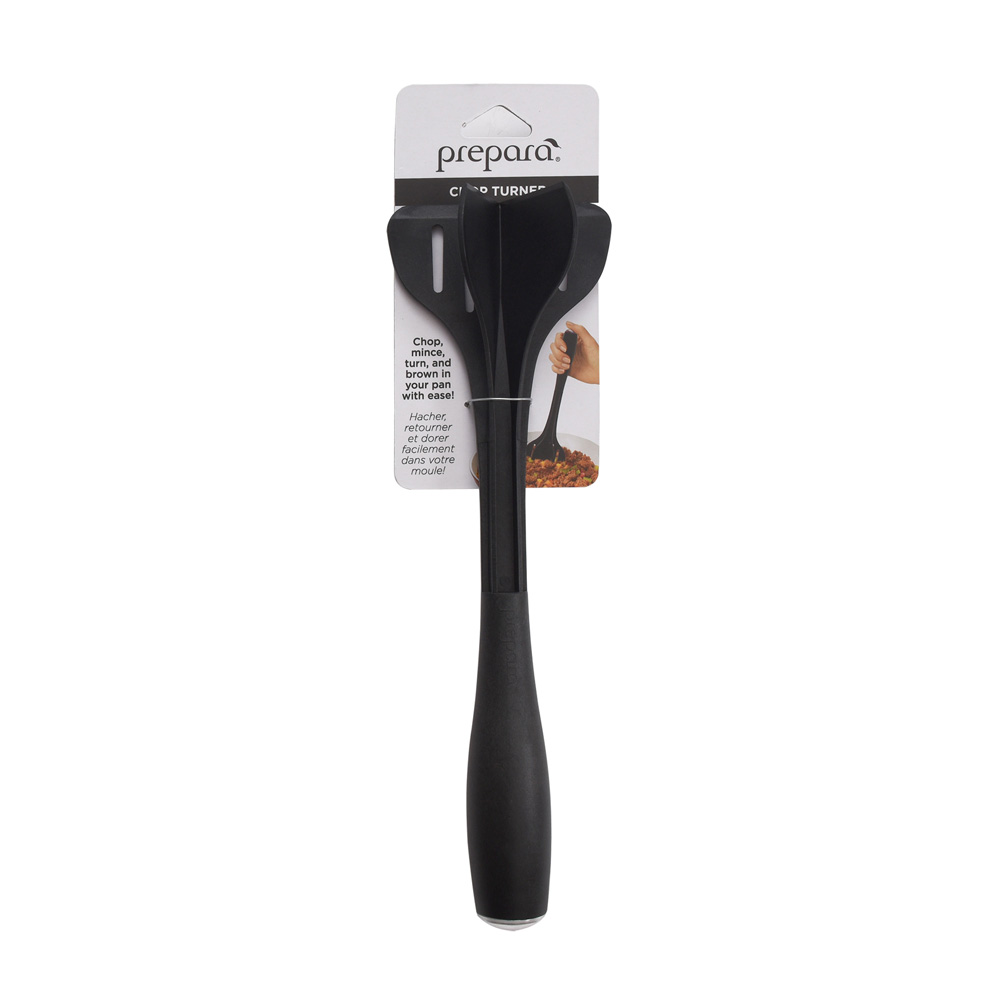 Prepara Chop Turner kombinerar funktionerna hos en spatel och en kötthackare så att du kan hacka, vända medan du bryner kött, allt med ett praktiskt verktyg. Designad med en höjande fot för att hålla det kladdiga huvudet borta från bänkskivan, och en dekorativ ände för att tillåta färg- och stilvariationer. Detta högtemperaturbeständiga verktyg får jobbet gjort. Praktiskt och snyggt. Fungerar bra med allt kött, tofu, köttersättning. Tål diskmaskin.