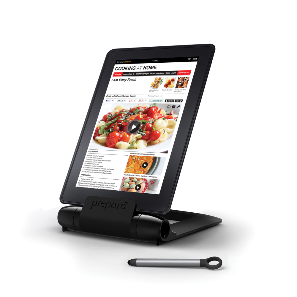 Preparas stativ för läsplattor passar alla plattor i antingen stående eller liggande läge. En penna ingår för att hålla skärmen ren från smutsiga händer. En stabil bas och halkfria gummigrepp håller ditt stativ på plats!