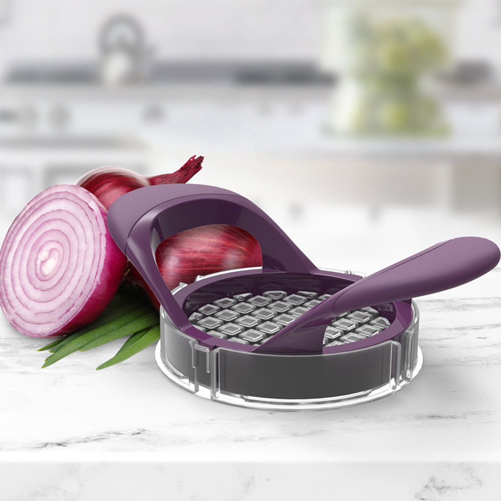 Prepara Lökhackare hackar löken åt dig. Pressa hackaren med båda händerna över löken så att knivarna skär igenom löken och ända ner i spåren på brickan.