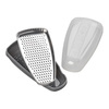 Den har ett rivjärn i rostfritt stål, en plastbehållare för att fånga upp och förvara den rivna osten och ett lock för att hålla den fräsch. Den här typen av rivjärn är idealisk för att lägga nyriven ost direkt till rätter och samtidigt minimera röran.