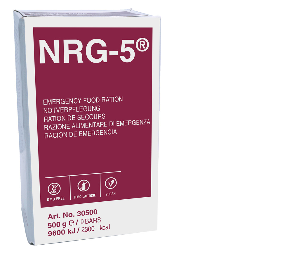 Trek N Eat NRG-5 Emergency Ration består av energirika, komprimerade rån. De är förpackade i en hermetiskt förseglad flerskiktsförpackning och kan förvaras i upp till 20 år. Rånen har en milt söt smak och kan ätas direkt som kex eller blandas med varmt vatten. Förpackningens låga totalvikt (innehåller 9 rån) gör den enkel att bära och dela under överlevnadsresor. Den förseglade förslutningen skyddar innehållet effektivt från luft och fukt, vilket möjliggör långtidsförvaring som nödfoder.