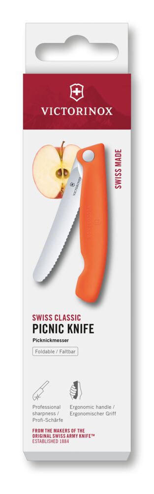 Victorinox Swiss Classis Picnic Knife är en vikbar skalkniv, perfekt för picknicken, vandringsturen eller varför inte till svampplocket. Otroligt mångsidig, högkvalitativ, lätt att fälla ut och in samt lätt att bära med vart som helst. De färgglada handtagen gör kniven till ett måste vid alla tillfällen då det ska skalas och skäras.