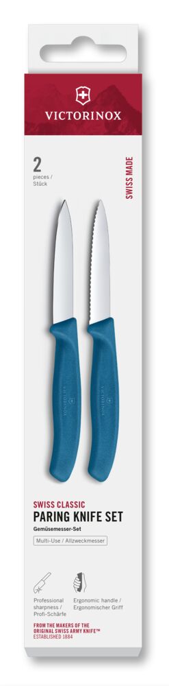 Victorinox Swiss Classic Paring Knife 2 pcs är skalknivssetet som inkluderar en rak kniv och en sågtandad kniv i rostfritt stål, redo för alla köksbestyr. Skiva tomater, avokado och fikon, eller skär igenom granatäpplen, litchi och passionsfrukter utan ansträngning, med dessa lätta ergonomiska handtag och vassa blad är du redo för alla utmaningar köket kan komma med.